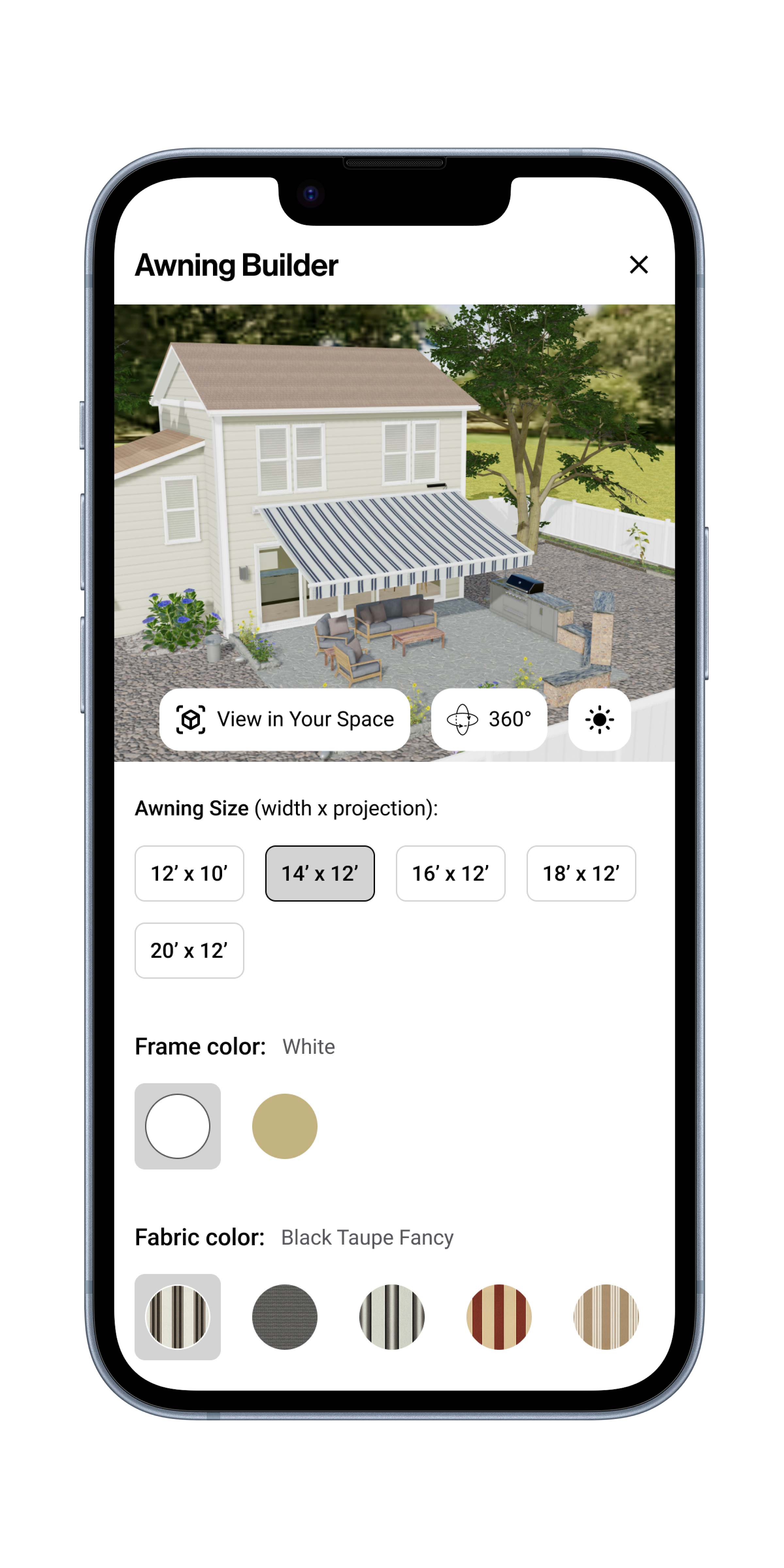 Enjoy a 3D view of your new awning while toggling options like size, color, and fabric style. Want to visualize it in real space? Easily launch our augmented reality (AR) feature, using your phone!